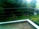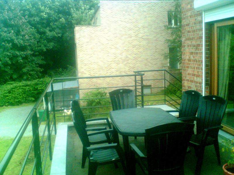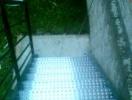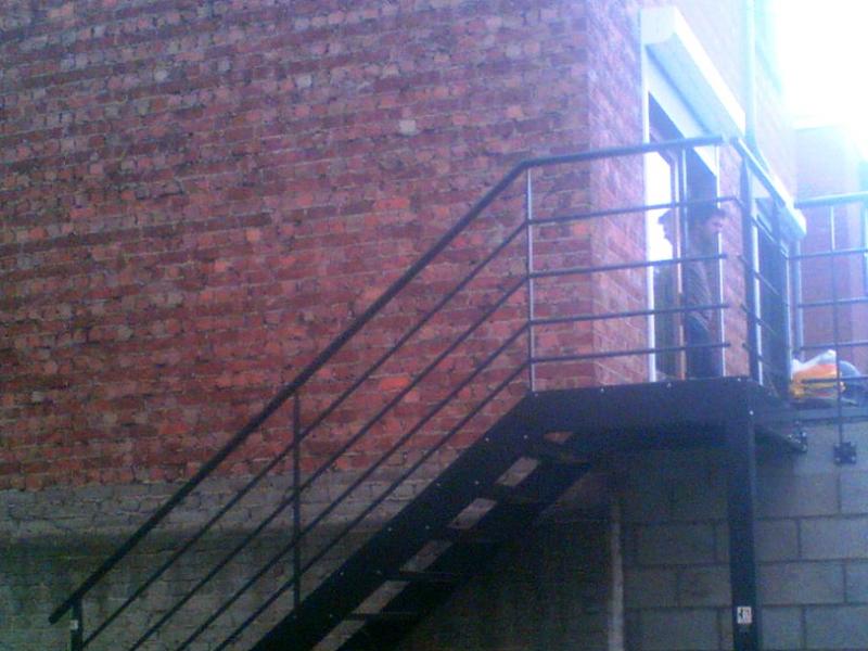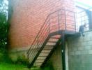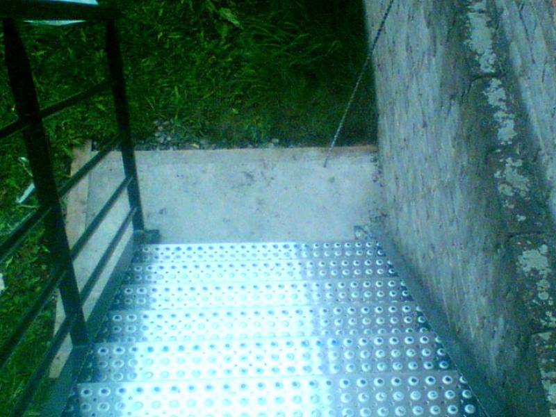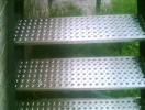 Escalier extérieur "Droit" - à limons extérieurs Marches INOX à perforations "repoussées" auto nettoyantes. Avec palier et garde corps assortis. La terrasse est totalement utilisable grâce à la fixation extérieure.