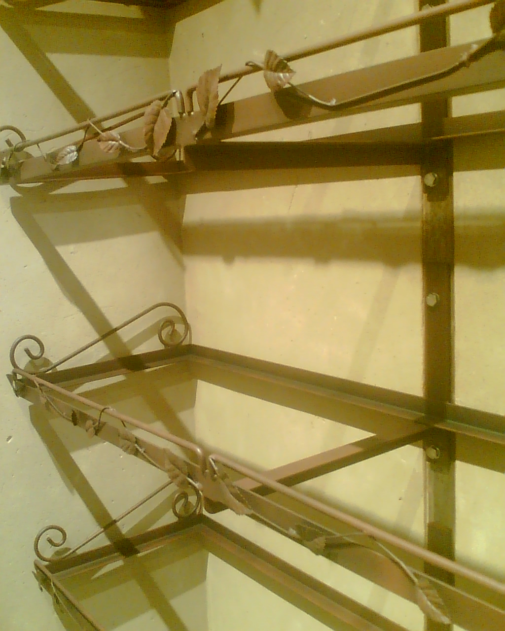 Etagère à pains réalisée en acier poudré teinte rouille avec décoration de feuilles forgées.