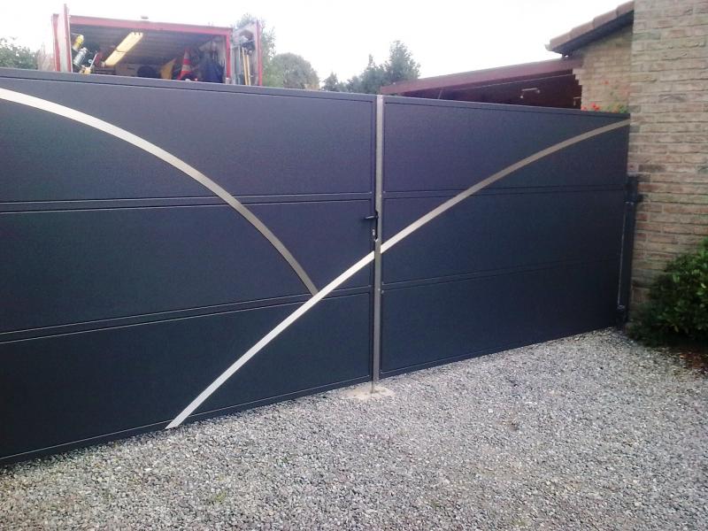 Portail tôlé - simple face - avec décoration INOX appliquée par rivetage et collage à haute résistance. Le châssis galvanisé en bain (450/480°)après fabrication et le revêtement en tôle ALU garanti une durée de vie très longue.