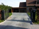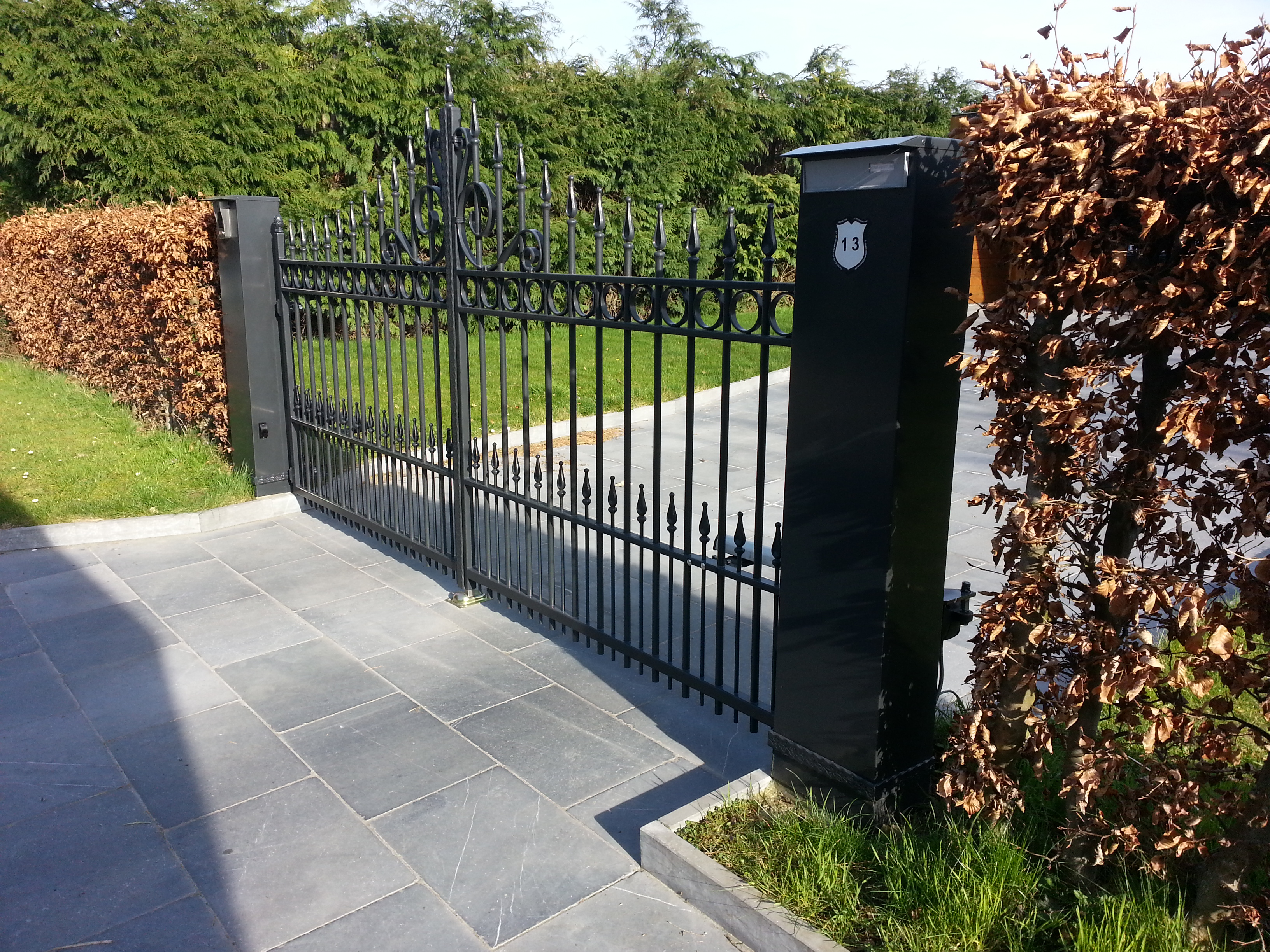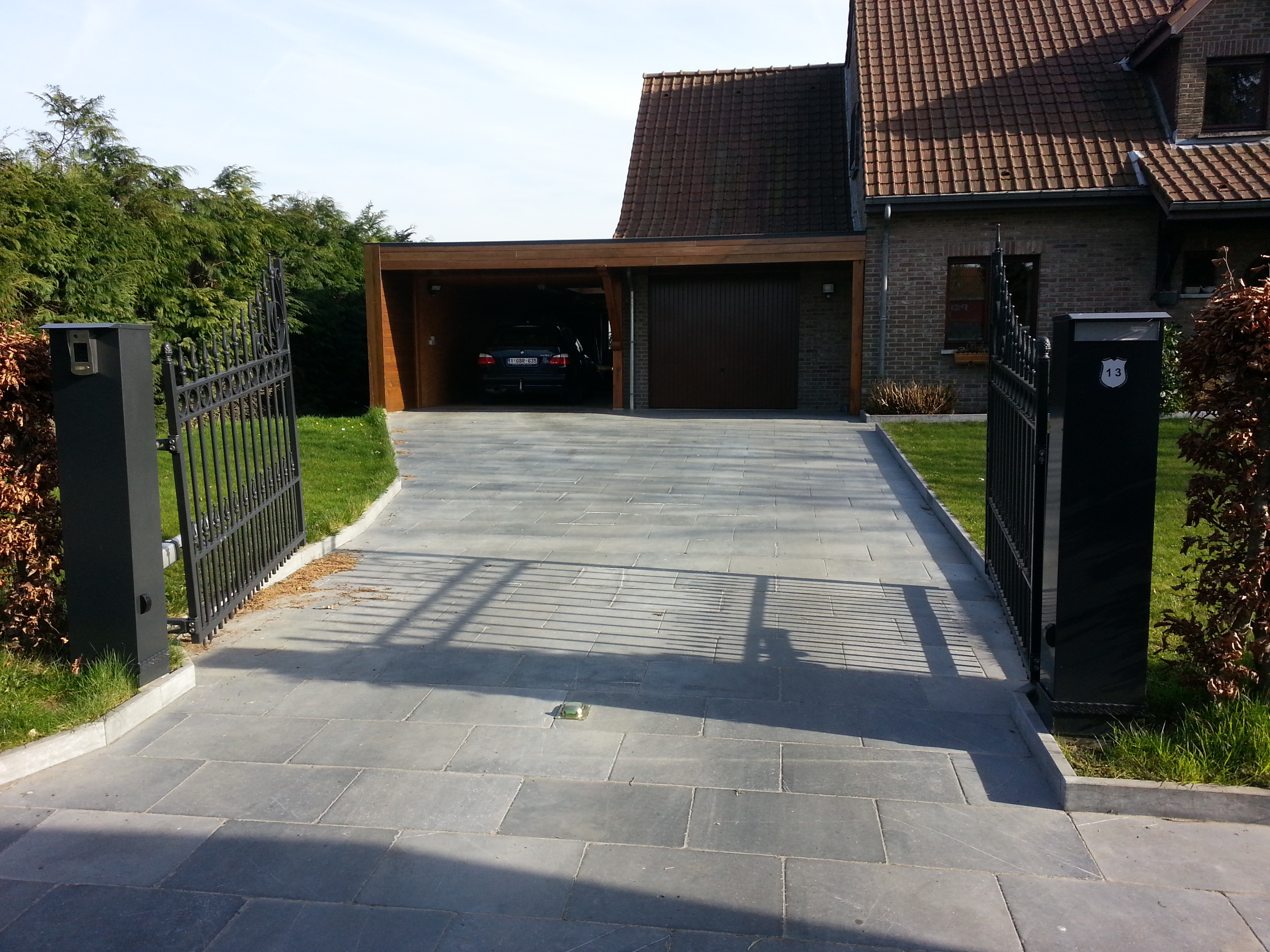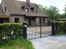 Le portail est équipé de charnières déportées articulées réglées pour absorber la pente montant vers la propriété.