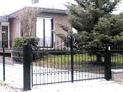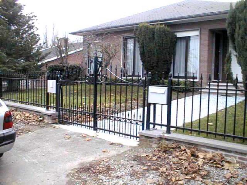Portail fer forgés classique à grand volute surmonté d'un coeur. Décoration inférieur du double barreaudage avec de volutes "C" forgés terminés en patte d'oie.