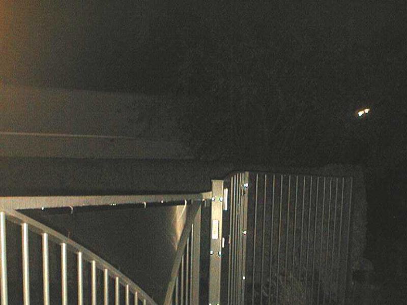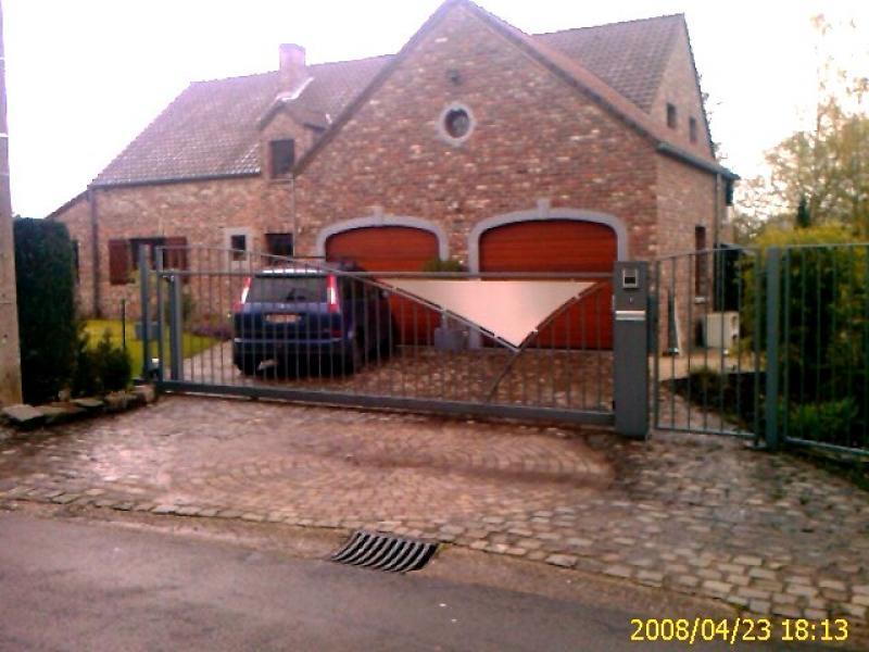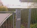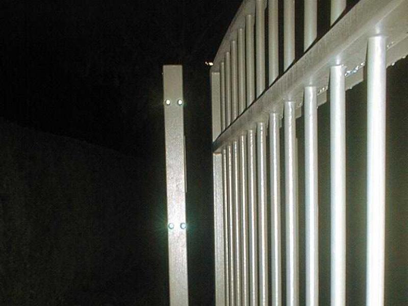 Portail dissymétrique - Croisement de deux courbes avec un remplissage en INOX. Intégration d'éclairages Leds (télécommandés) dans les poteaux et la colonne boîte aux lettres. Les ouvertures du portail, du portillon, de la porte de garage et des éclairages sont intégrés dans les télécommandes à 4 canaux ainsi que dans les vidéophones. Le clavier codeur permet au choix, l'ouverture du portillon ou du portail coulissant. L'intensité lumineuse des Leds est réglable par "dimer"