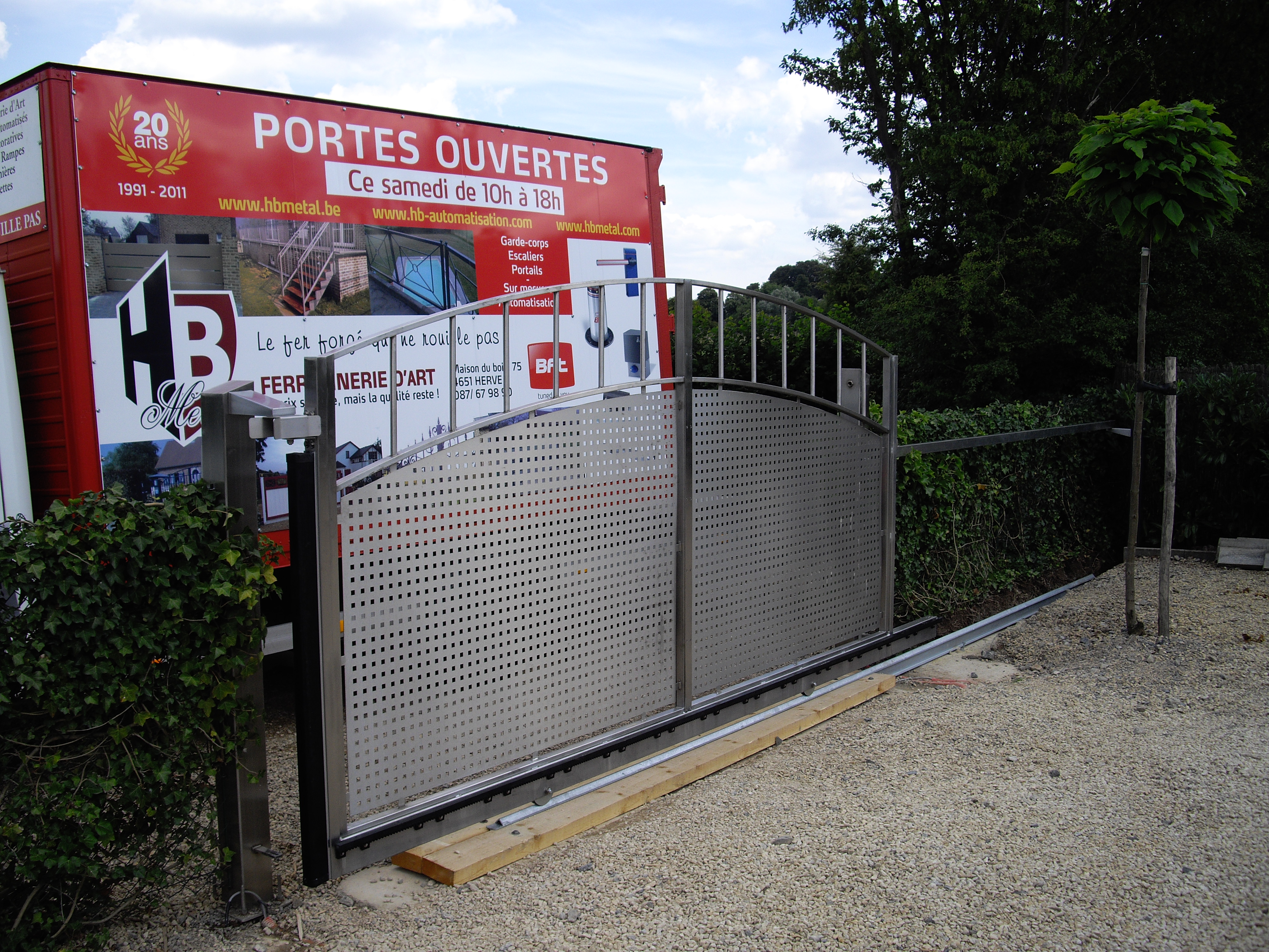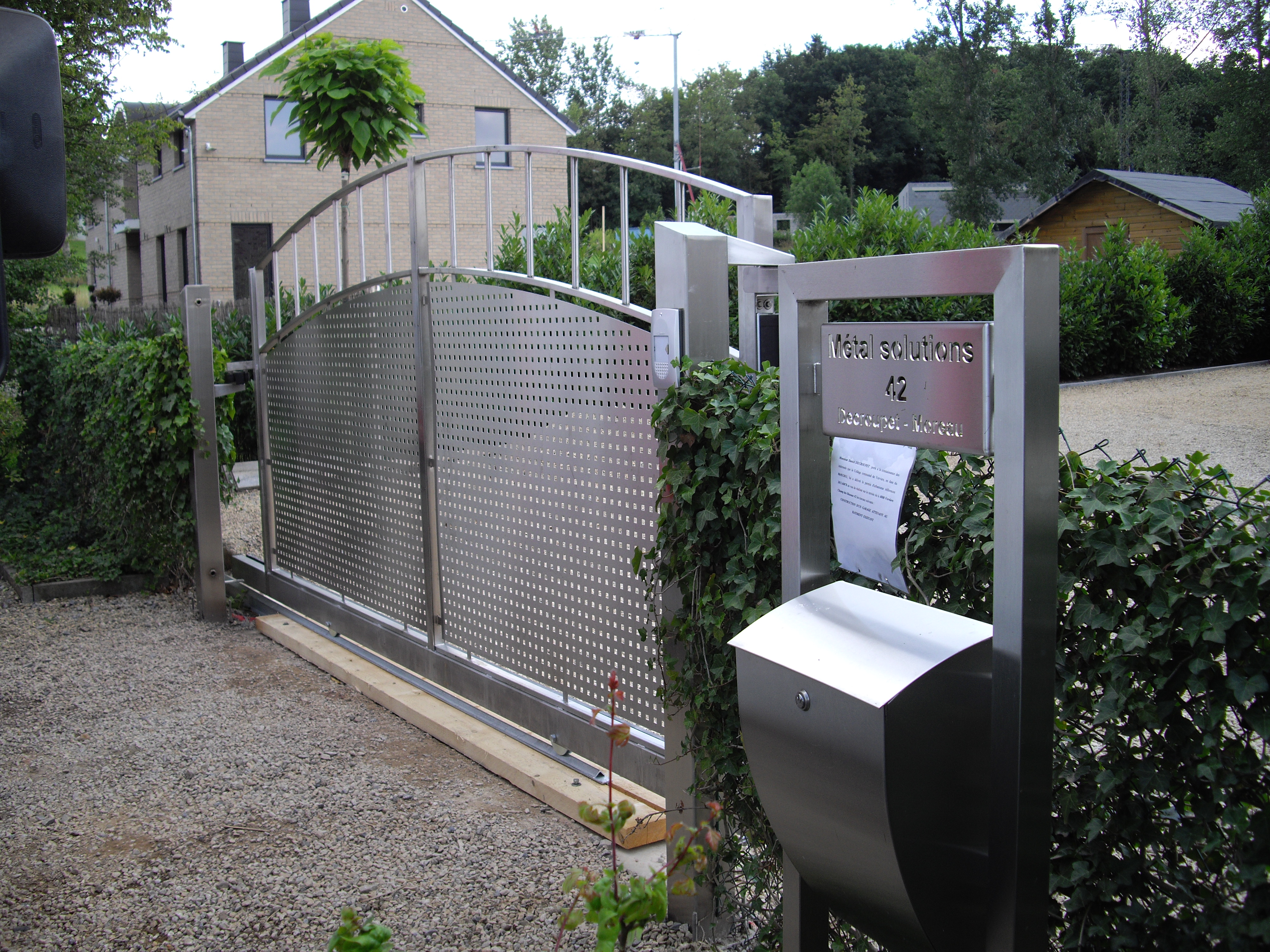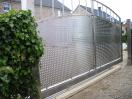 Portail coulissant sur rail- Barreaudage et châssis tout INOX. Design épuré - L'élégance de la simplicité Automatisation BFT - URANO Eclairages Leds télécommandés incorporés dans les poteaux. Clavier codeur et