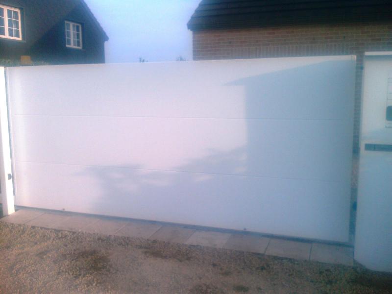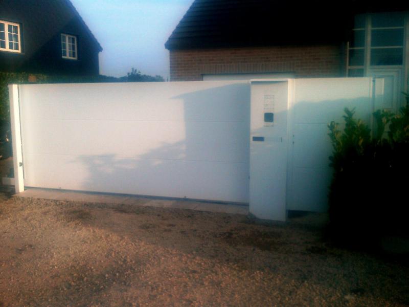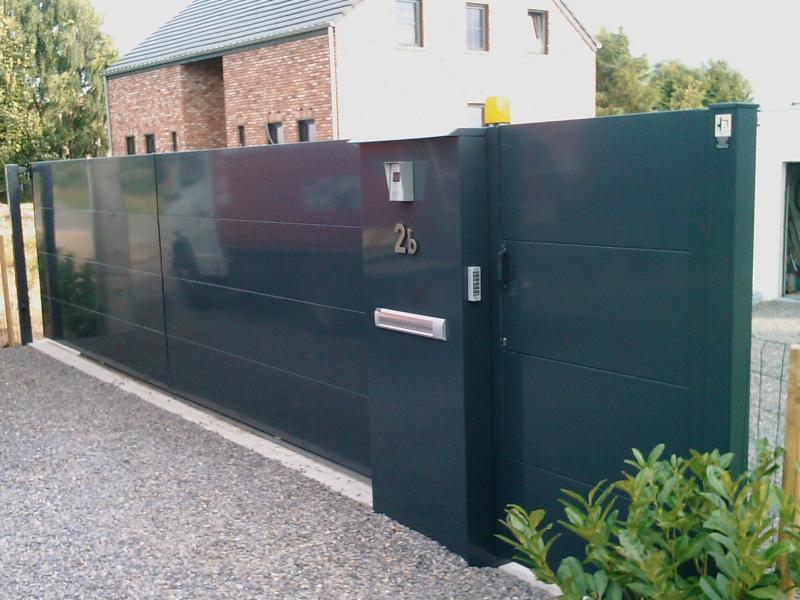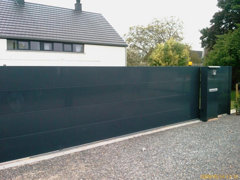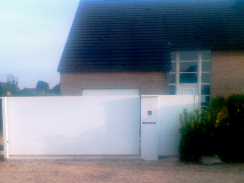 Portail opaque Tôlé simple ou double face. Tôles jointives assemblées par rivetage et collage. Aucune fixation mécanique visible. Réalisable en 3-4 ou 5 ondes jusqu'à des hauteur de 2m50 (ou plus sur demande) Longueur non limitée. Les tôles aluminium sur châssis acier galvanisé et poudrés séparément permettent une construction à la fois ROBUSTE et LEGERE.