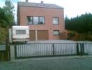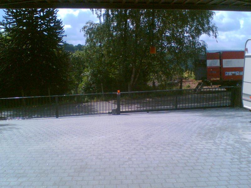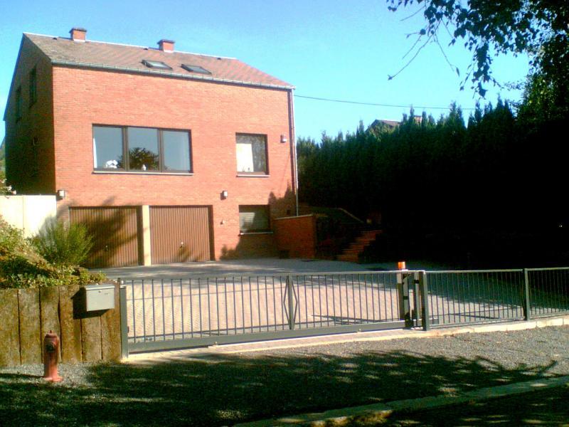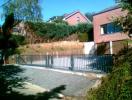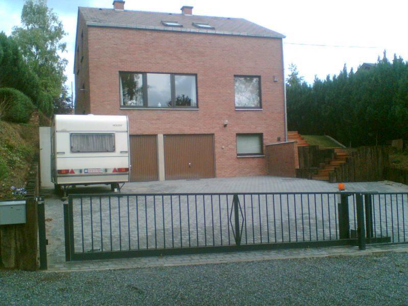 Portail coulissant sur rail incliné adapté la topographie de l'entrée. Sol incliné, pente montante vers la maison. Besoin d'une ouverture large pour manoeuvrer la caravanne. Le portail incliné coulisse derrière une grille fixe suivant la pente du sol. Largeru d'ouverture maximum!