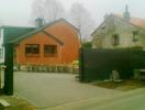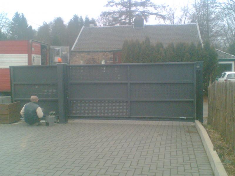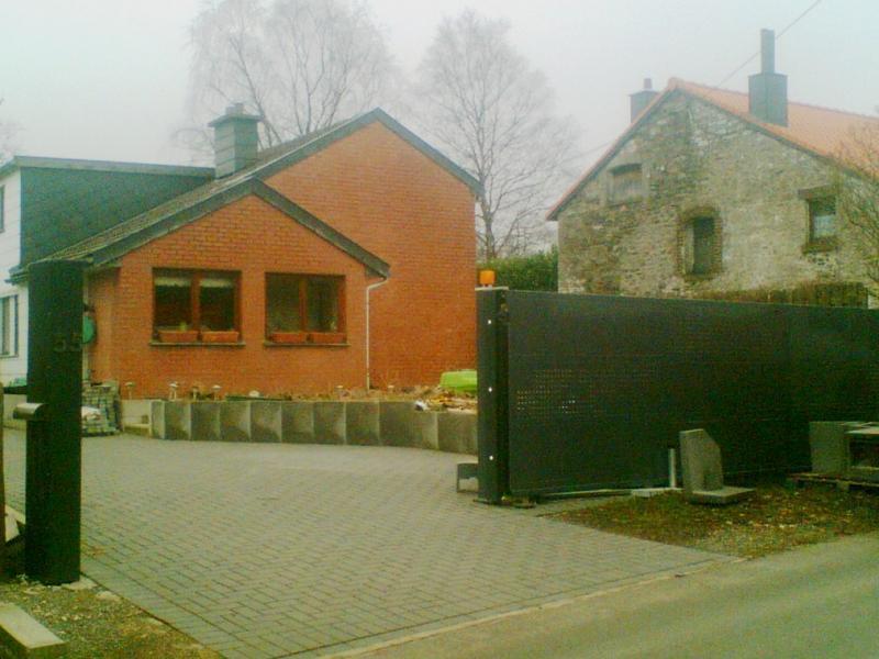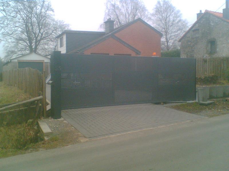 Portail tôlé "une face" avec panneaux pleins et perforés disposés en damier. Ici la solution du "coulissant autoportant" était privilégiée par le client qui ne souhaitait pas réouvriri une entrée en "klinkers" récemment aménagée. L'élément de boîte aux lettres ainsi que le poteau support du portail sont pourvus d'éclairages LEDs incorporés.