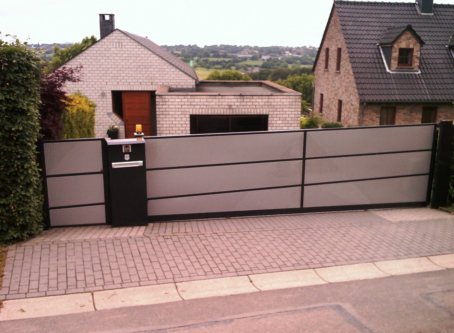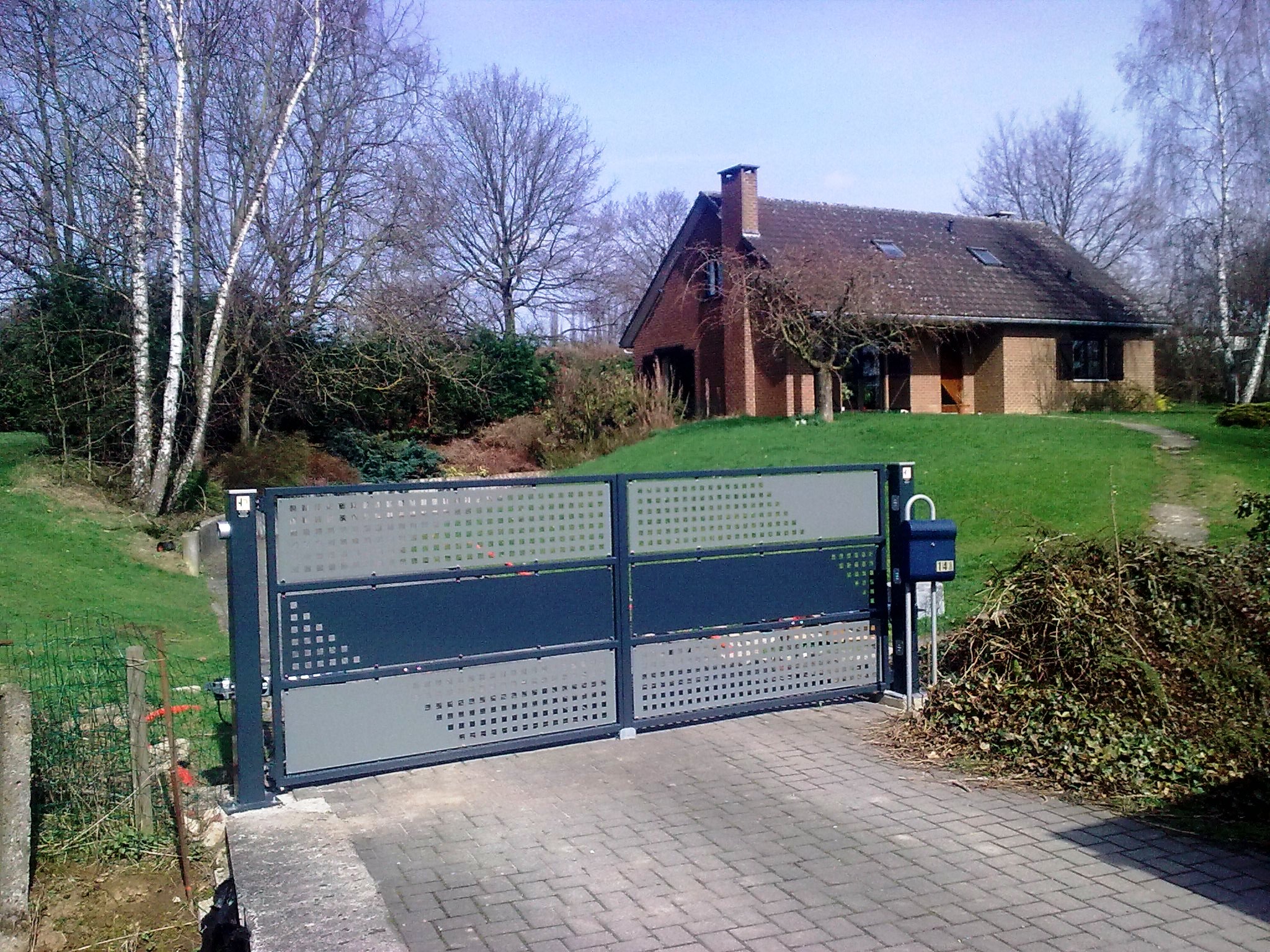 Portails carrés ou rectangulaires tôlés avec une multitude de design possibles. Décorations par découpage laser ou perforations et/ou par application de motifs en vinyl